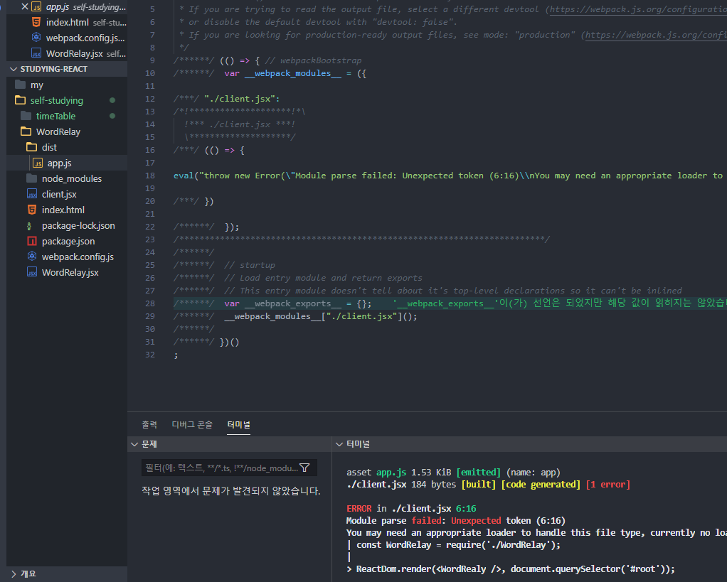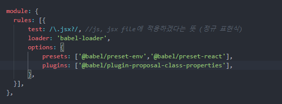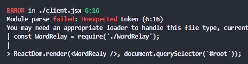 jsx파일을 읽어오는 곳에서 에러가 발생한다. webpack에도 babel을 추가로 설정해주어야 한다.