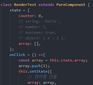 객체, 배열 등 참조 관계가 있는 경우에는 PureComponent도 바뀐 지 안 바뀐 지를 잘 알아차리지 못함