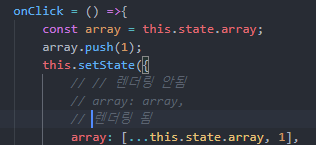 setState에서 {a : 1}을 할 때 새로 렌더링 하므로 state에는 객체 구조를 안 쓰는 것이 좋다.
