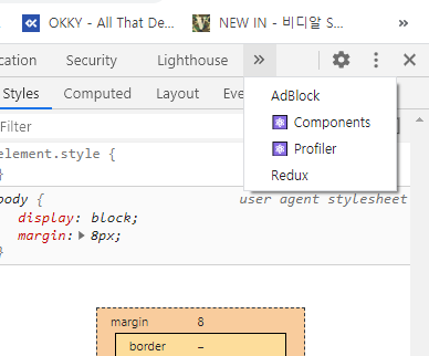 다운로드하고, F12를 눌러 개발자 환경에 들어가 화살표 표시를 클릭하면, Components 탭과 Profiler 탭이 생긴다.