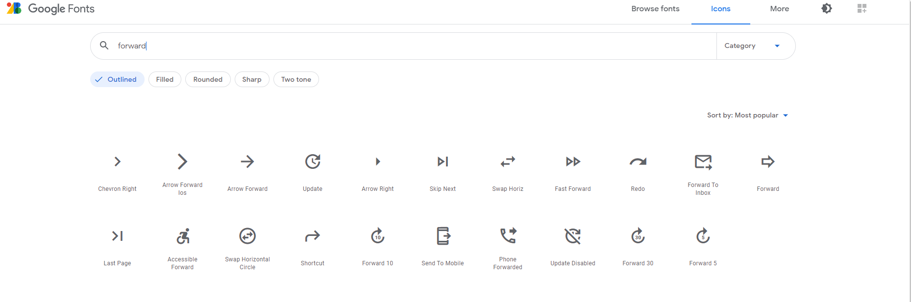 필요한 아이콘을 검색한다. 나는 "다음(forward)" 아이콘을 이용할 것이다.